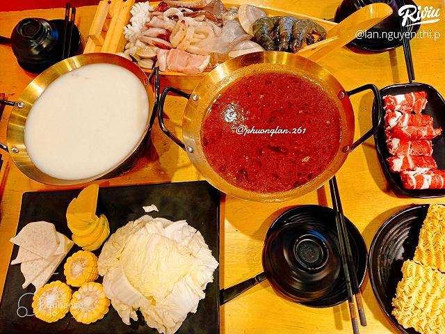 - Mình đi 2 người gọi set 2 vị lẩu Shacha đậm đà nhưng không cay tê như lẩu Mala thích hợp cho các bạn không ăn cay được nè 😍 và Phô mai sữa tươi béo béo ngọt ngọt 😜