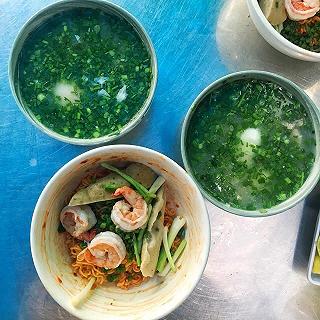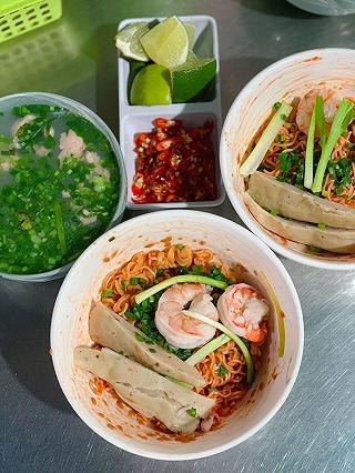 Mì trộn muối ớt khá cay nhưng rất ngon nha. Bún nước trúng ,chả ,tôm ăn rất đậm đà,thanh thoát, ấm bụng nha mọi người. Mình thích ăn hành nên cái chén nước cô đưa mà mlem mlem.Nằm ở gần khu chung cư...