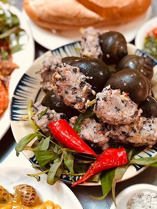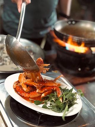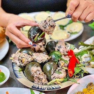Tụi tui gọi 5 món càng ghẹ rang me, ốc bươu nhồi thịt, ốc hương sốt trứng muối, sò điệp nướn...